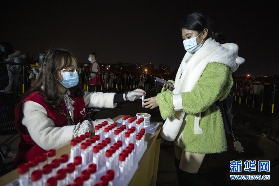 12月11日晚,在位于四川成都市郫都区的西华大学本部,学生在操场上进行核酸检测。 当日,成都市郫都区新型冠状病毒肺炎疫情防控指挥部发布通告,从2020年12月11日18点00分开始,全面开展郫都区全员新冠肺炎疫情核酸检测,确保不漏一人。检测费用由区政府承担。 新华社记者 沈伯韩 摄