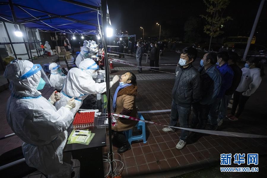 12月11日晚,人们在位于四川成都市郫都区的成都现代工业港核酸检测点进行核酸检测。 当日,成都市郫都区新型冠状病毒肺炎疫情防控指挥部发布通告,从2020年12月11日18点00分开始,全面开展郫都区全员新冠肺炎疫情核酸检测,确保不漏一人。检测费用由区政府承担。 新华社记者 沈伯韩 摄