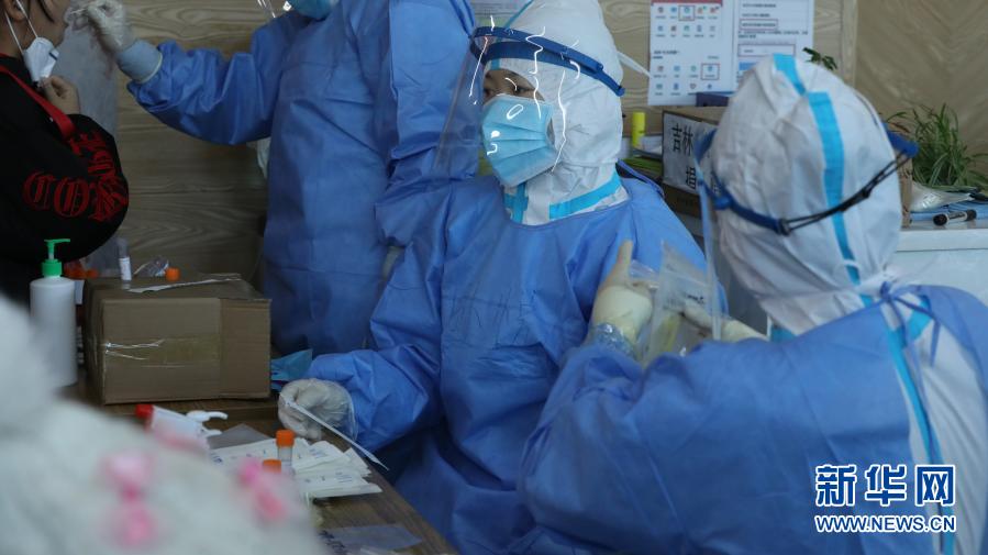 医护人员在绥芬河市核酸检测站点工作(12月11日摄)。
