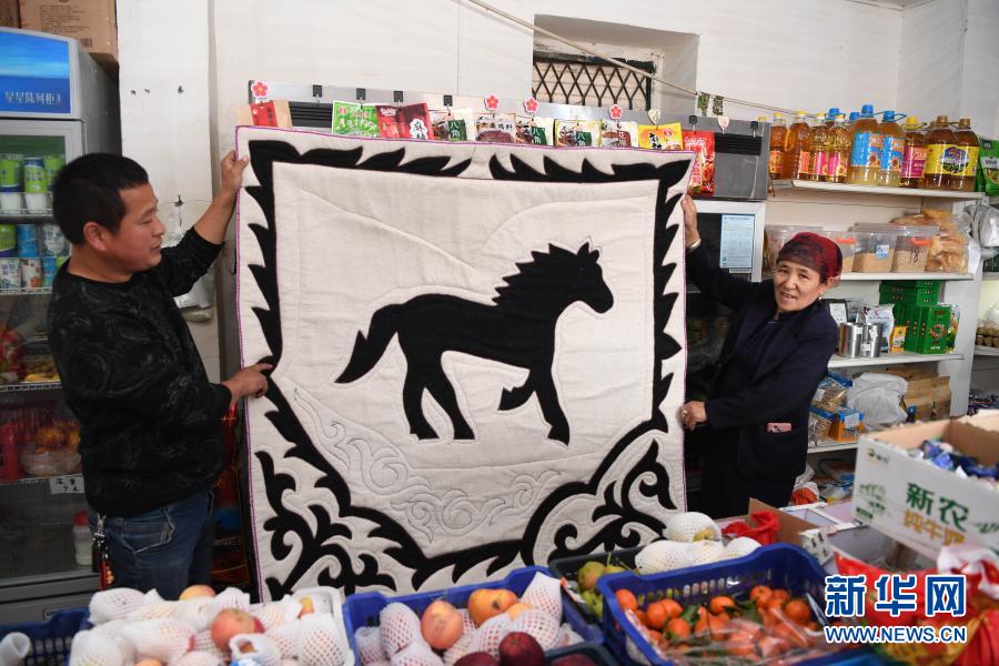 4月14日,新疆托里县多拉特乡加玛特村电子商务服务点负责人刘志江(左)与贫困户马合甫扎·阿勒木赛依提一起展示销售的产品。新疆托里县大力发展农村电子商务普及应用,开展代销贫困户土鸡蛋、牛肉干、手工艺品等各种产品业务。电商正在成为该县助推农户增收的新业态、新模式。