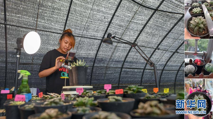 拼版照片:左图为8月19日,吉林省辽源市西安区灯塔镇碾山村村民苑丽娜在大棚内直播售卖多肉植物(新华社记者 张楠 摄)。右上中下图均为消费者网络购买多肉后的反馈图(资料照片,新华社发)。