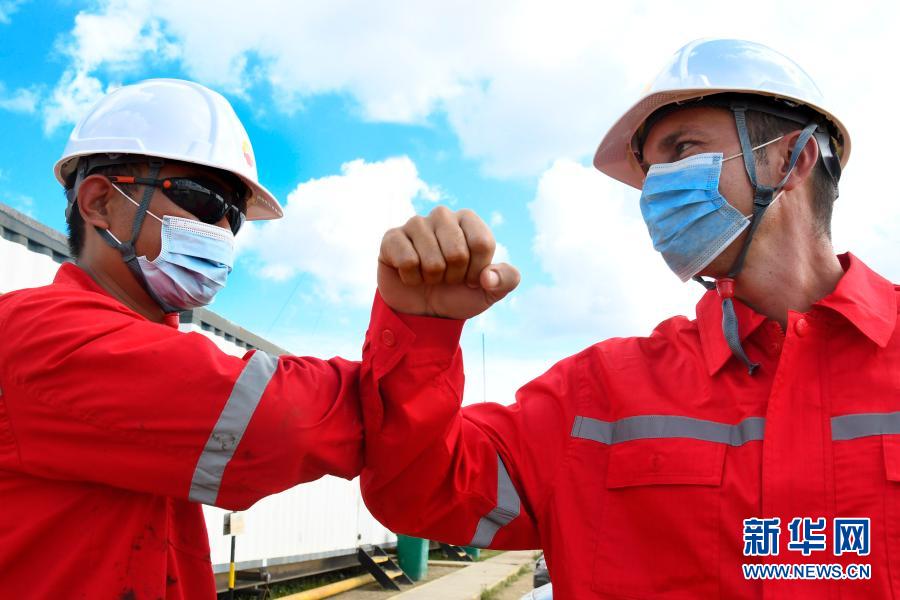 11月27日,中国石油集团长城钻探工程公司古巴项目GW91钻井平台中方员工(左)同古方员工互相致意。