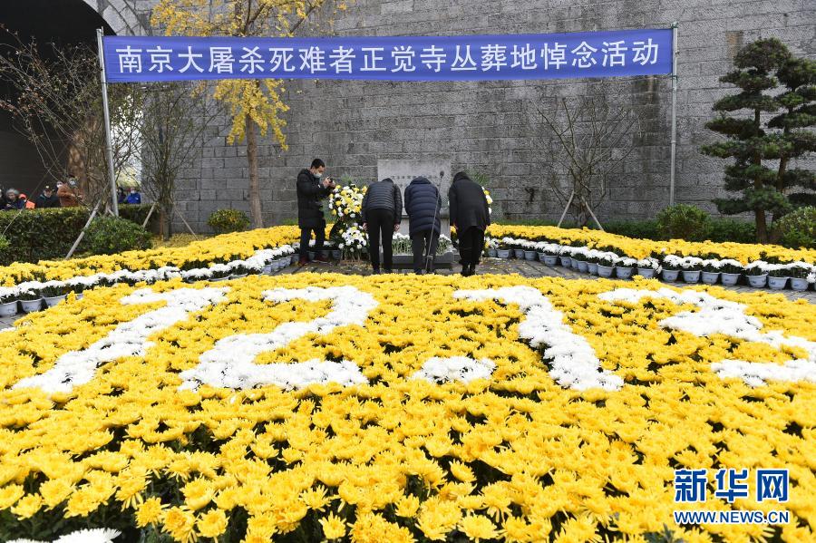 12月13日,在侵华日军南京大屠杀死难同胞丛葬地(正觉寺),参加悼念活动的群众在遇难同胞纪念碑前鞠躬。