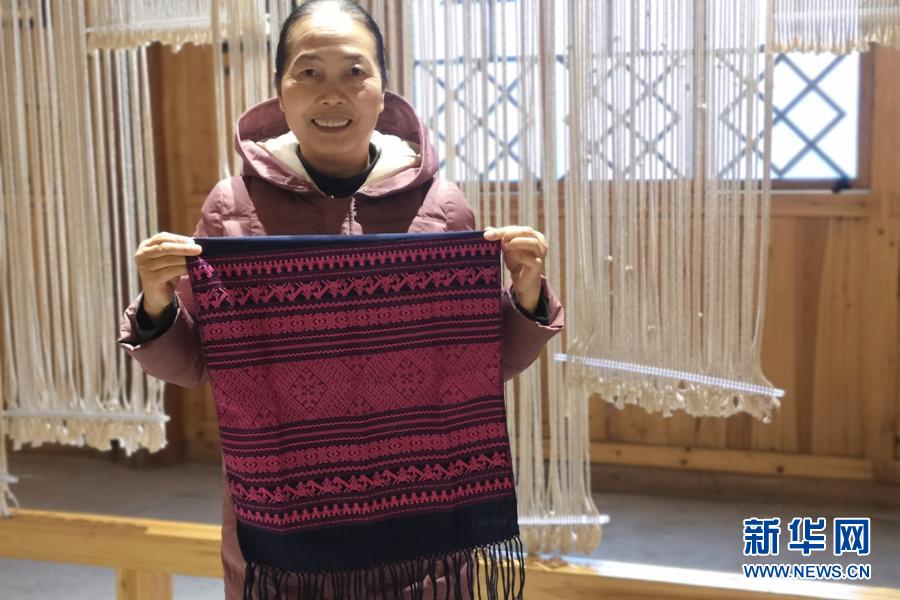 在湖南怀化通道侗族自治县牙屯堡镇文坡村,粟田梅在展示侗锦作品(12月3日摄)。新华社记者 袁汝婷 摄
