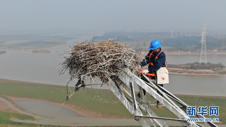 随着天气转冷,大批候鸟飞抵鄱阳湖。因为东方白鹳习惯飞回旧巢,电力部门为了保障输电设施安全给这座铁塔安装了防鸟粪设备,还专门安排工人上塔对鸟巢进行加固,既保供电又保候鸟。
