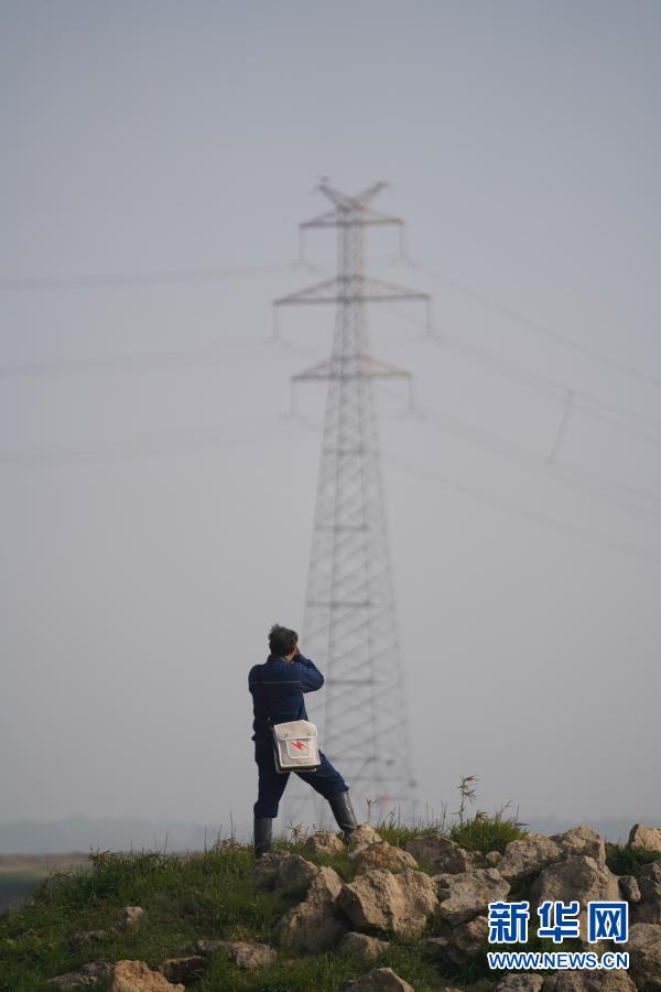 电力工人在远处观察铁塔上的鸟巢(12月12日摄)。新华社记者 周密 摄