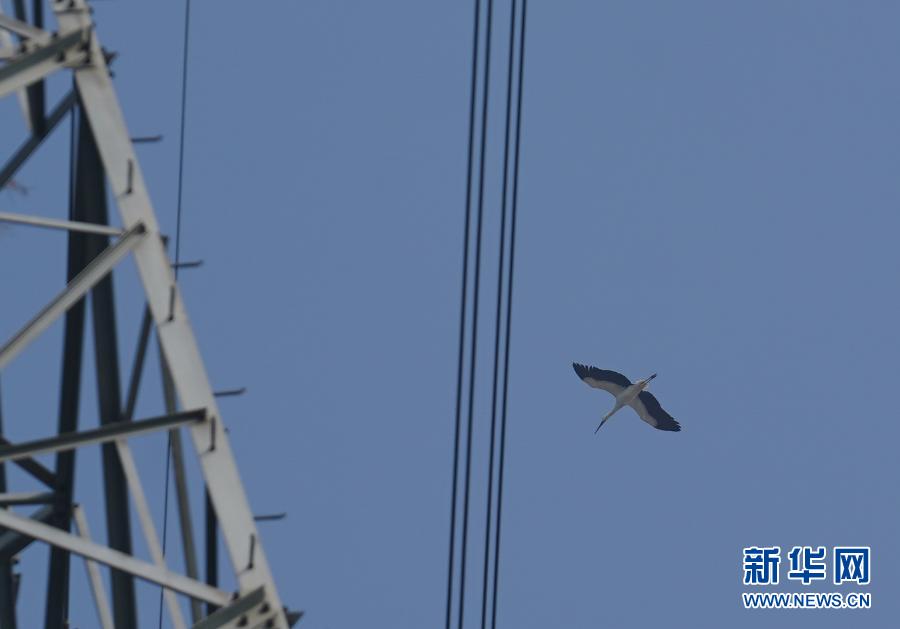 东方白鹳在铁塔旁盘旋(12月12日摄)。新华社记者 周密 摄