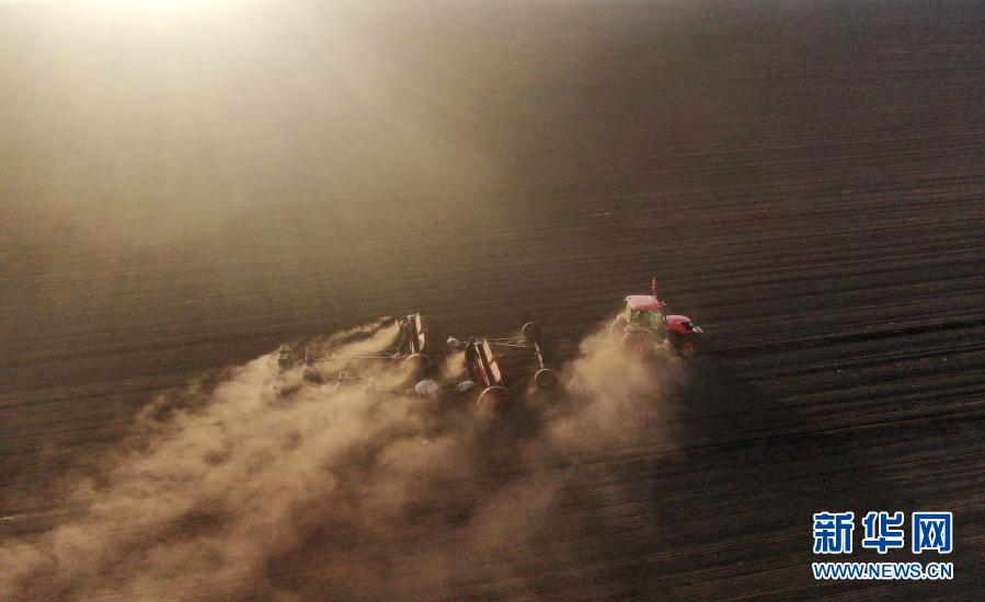 5月15日,在位于祁连山脚下的青海省海北藏族自治州门源回族自治县,工人驾驶农机在油菜田里播种(无人机照片)。