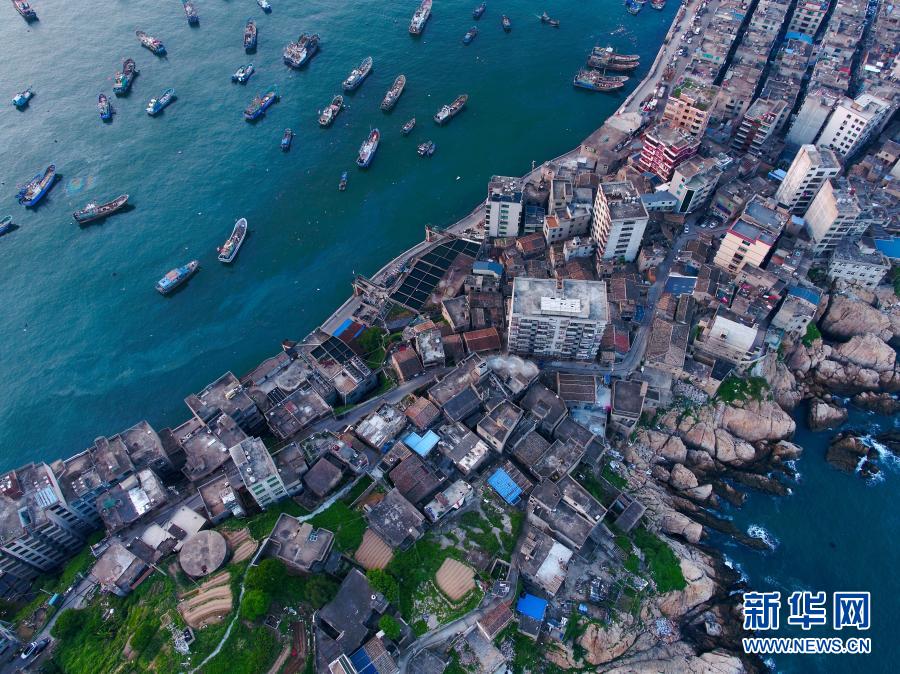 休渔渔船停泊在福建省连江县苔菉镇北茭村海湾内(5月13日摄,无人机照片)。