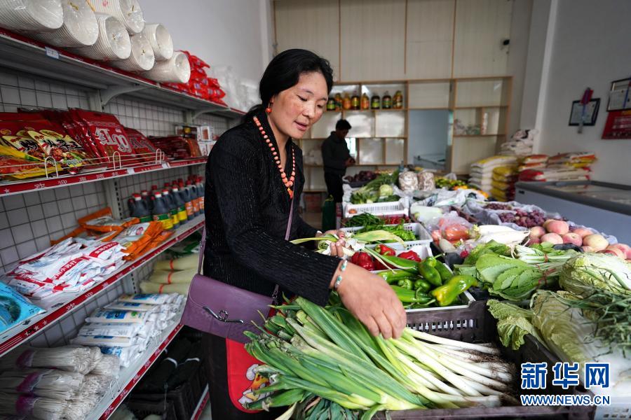 在西藏昌都市类乌齐县桑多扶贫开发区易地扶贫搬迁安置点,长毛岭乡达雄村村民阿丁(前)和丈夫俄金在蔬菜店里整理蔬菜(9月22日摄)。2018年,阿丁和家人从达雄村搬迁到安置点,住进了100平方米的新居。搬到安置点后,阿丁和丈夫租了一间40多平方米的店面,做起了蔬菜生意。