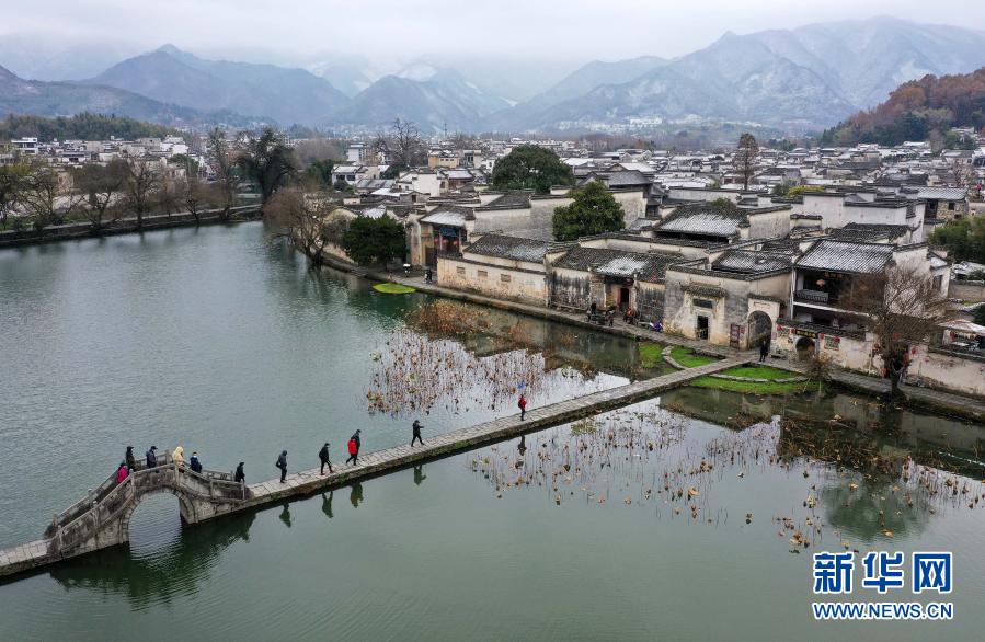12月14日,游人在雪后的安徽黄山黟县宏村游玩(无人机航拍)。