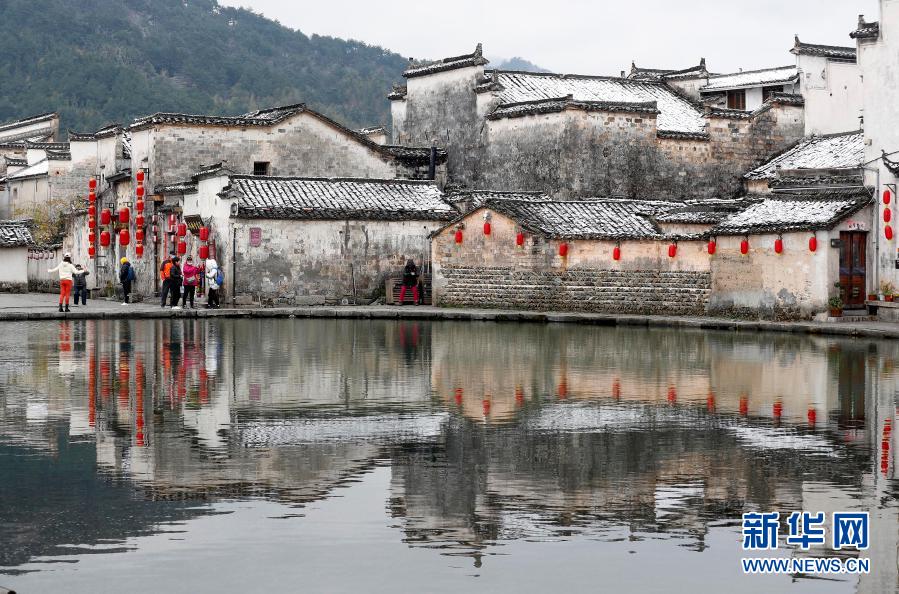 12月14日,游人在雪后的安徽黄山黟县宏村游玩。