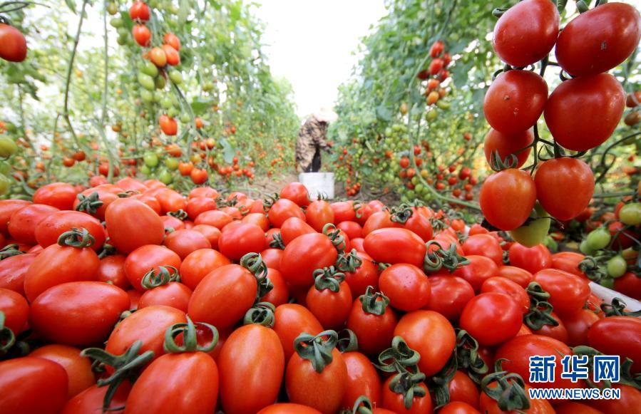 12月14日,山东省枣庄市峄城区古邵镇沙路口村农民在温室大棚内采摘圣女果。