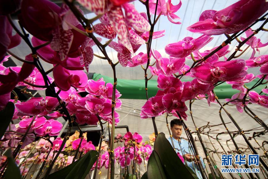 12月13日,山东省枣庄市市中区永安镇蔡庄村农民在温室大棚内管理蝴蝶兰。