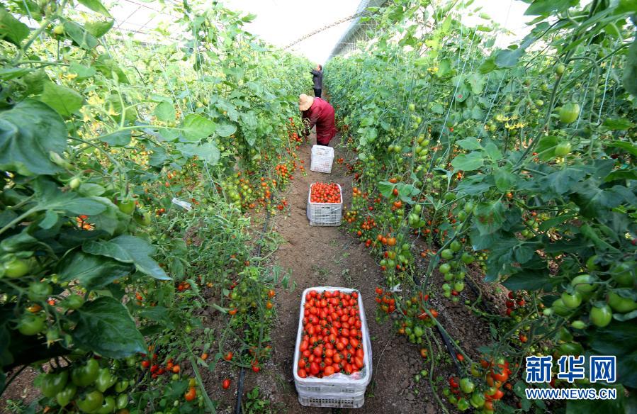 12月14日,山东省枣庄市峄城区古邵镇沙路口村农民在温室大棚内采摘圣女果。