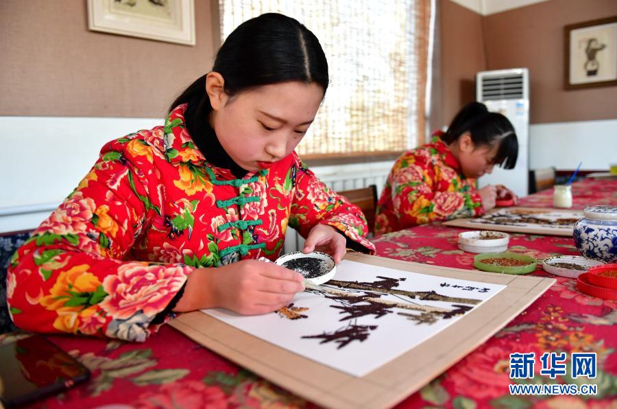 12月14日,村民在馆陶县粮画小镇制作粮食画。