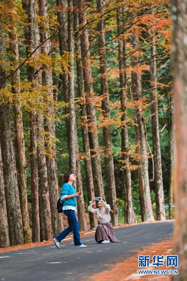 11月19日,游客在福建省三明市将乐县国家级自然保护区水杉大道游览。