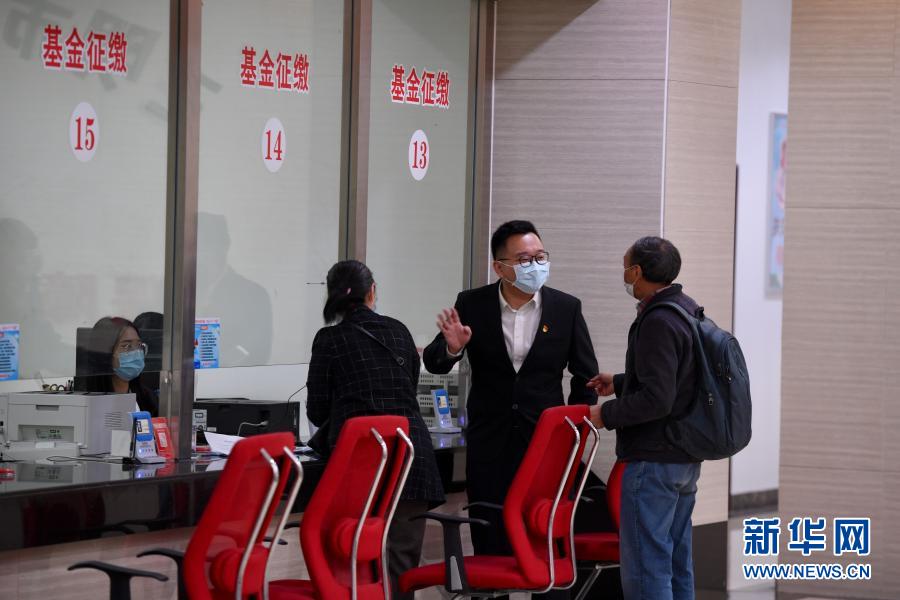 11月24日,三明市医疗保障基金中心工作人员(中)向居民讲解医保基金征缴问题。