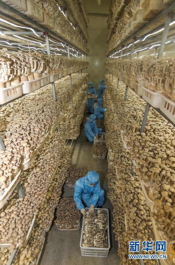 12月15日,在玉屏侗族自治县一家食用菌生产企业,工人在采收食用菌。