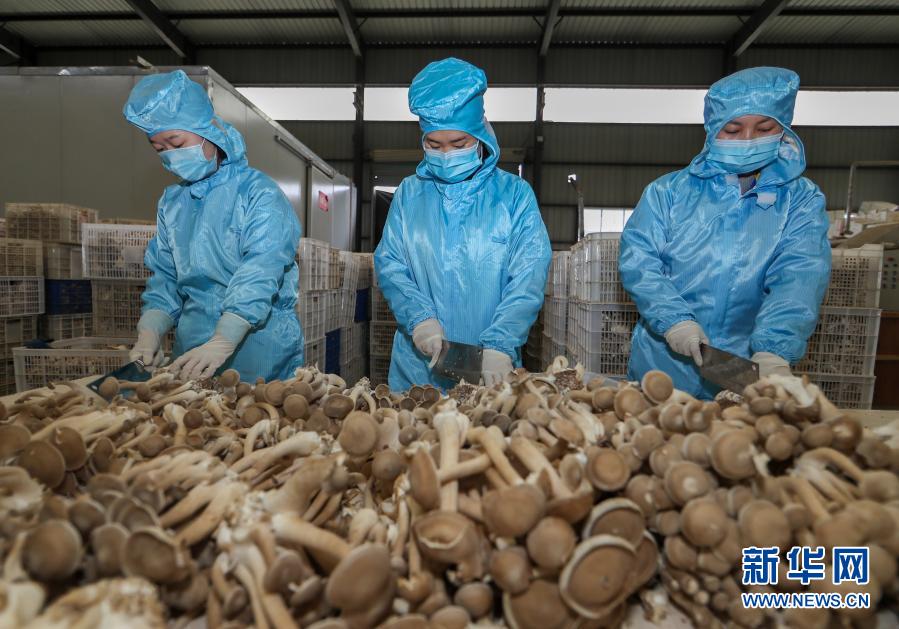 12月15日,在玉屏侗族自治县一家食用菌生产企业,工人在切割精选的食用菌。
