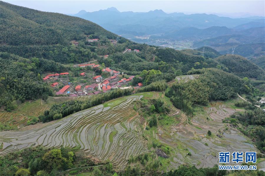 福建省三明市梅列区洋溪镇饱饭坑村梯田及民居(4月8日摄,无人机照片)。新华社记者 姜克红 摄