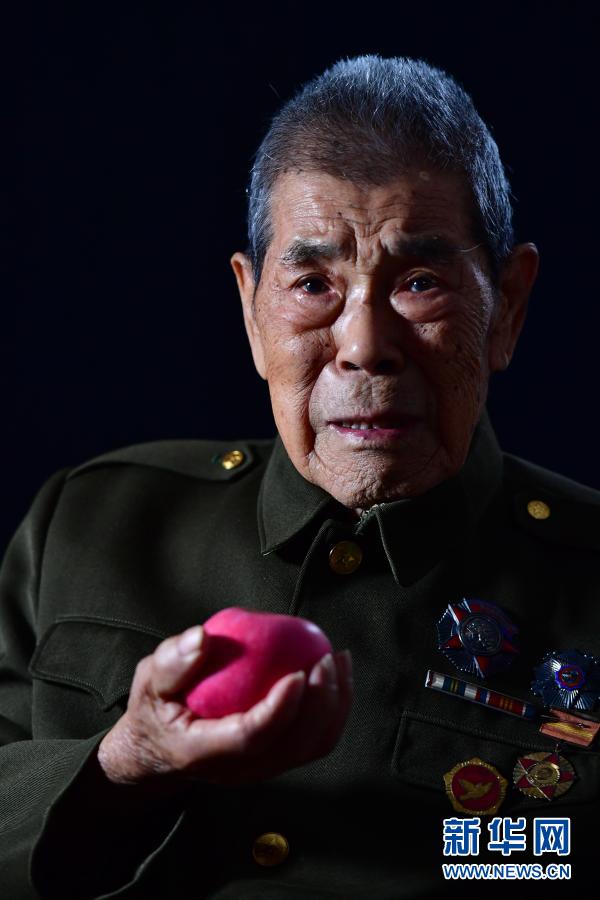 9月27日,志愿军老战士张计发讲述上甘岭战役“一个苹果的故事”。在上甘岭战役最艰苦的阶段,张计发让战友们分享一个苹果,可谁都舍不得吃,苹果传了一圈又完整地传回张计发手中。新华社记者 冯大鹏 摄