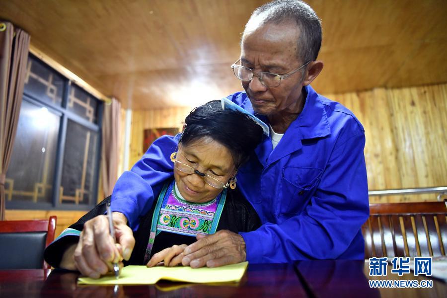 9月14日,桂黔乌英苗寨村民梁安合(右)手把手指导老伴梁英迷学习。两人青梅竹马,结婚已45年,如今依旧日出而作,日落而归,朝夕相伴,恩爱如初。新华社记者 李鑫 摄