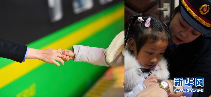 这是一张拼版照片,左图为:1月3日,朱梓芮和母亲卞菁在南昌西站站台分别(新华社记者胡晨欢摄);右图为:1月5日,朱梓芮为即将出乘的卞菁画上手表(新华社记者张浩波摄)。南昌客运段列车值班员卞菁因工作原因与女儿朱梓芮聚少离多,朱梓芮通过画“手表”的方式期盼妈妈早些回家。新华社发
