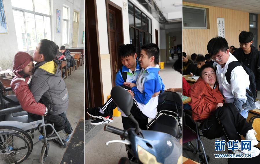 这是一张拼版照片,左图为:在广德市邱村镇中心小学,爱心帮扶小组成员将程东东抱上轮椅(2012年3月3日摄,新华社发);中图为:在广德中学,爱心帮扶小组成员抱着程东东回教室(2020年5月28日,新华社记者刘军喜摄);右图为:在巢湖学院,爱心帮扶小组成员抱着程东东来到教室(2020年10月19日,新华社记者刘军喜摄)。来自安徽省广德市邱村镇的程东东2008年被确诊为进行性肌营养不良症,逐渐失去行动能力,成为“渐冻人”。从2010年开始的10年间,由同学成立的三届帮扶小组接力帮扶,用爱心陪伴程东东成长。新华社发