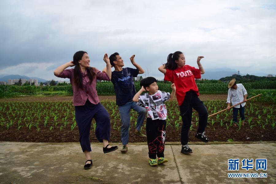 6月1日,浙江省瑞安市马屿镇霞岙村村民彭小英(左一)、范得多(左二)和两个孩子在跳“曳步舞”。18年前,范得多在一次车祸中受伤,并因惊惧过度患上抑郁症。4年前,妻子彭小英开始带着丈夫一起跳舞,二人在热情的舞蹈中挥洒汗水,范得多的情况出现了明显好转。如今,夫妇俩每晚在网络上直播跳舞,屏幕前漾出的笑容感染着越来越多的人。新华社记者 郑梦雨 摄