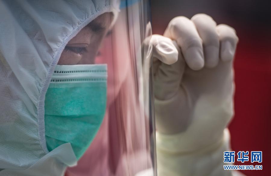 3月8日,武汉体育中心方舱医院正式休舱,来自贵州医疗队的叶青与康复患者分别时落泪并试图擦拭泪水。新华社记者 肖艺九 摄
