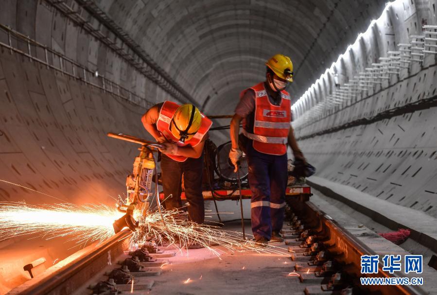 12月16日,技术工人在广州地铁18号线番禺广场站至横沥站区间进行轨道焊接点仿形精磨作业。