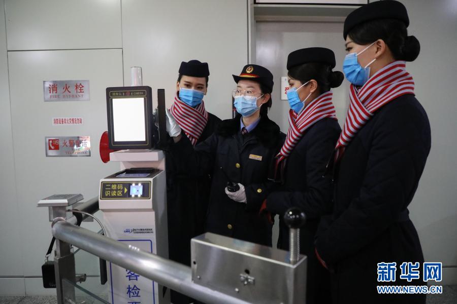 12月16日,在中国铁路兰州局集团有限公司中川机场站,一名客运员(左二)与东航甘肃分公司乘务员交流业务。