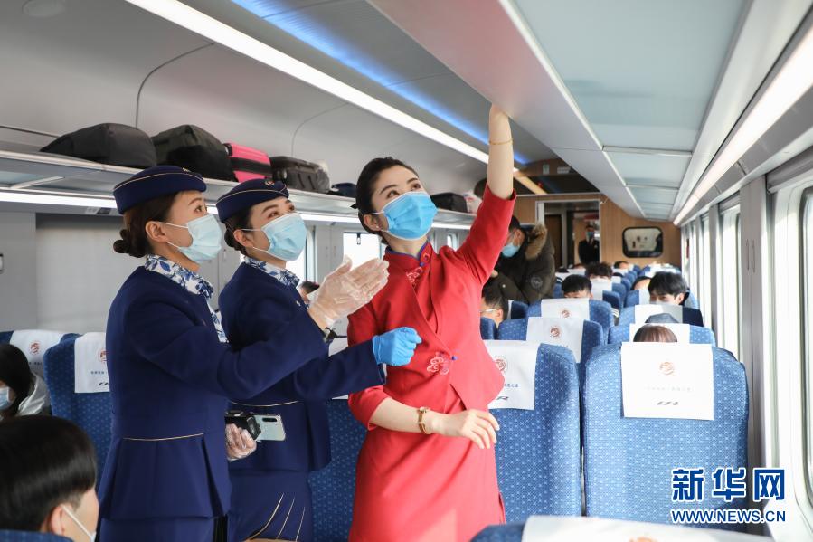 12月16日,东航甘肃分公司乘务员(右)与兰州客运段乘务员在C8502次列车上交流业务。