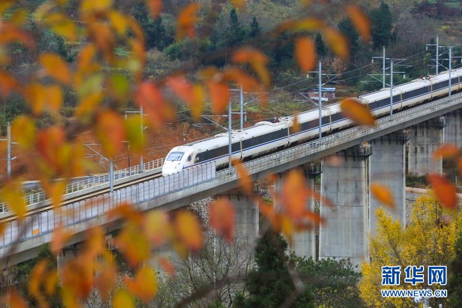成贵高铁列车行驶在贵州省毕节市境内(12月16日摄)。