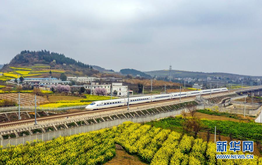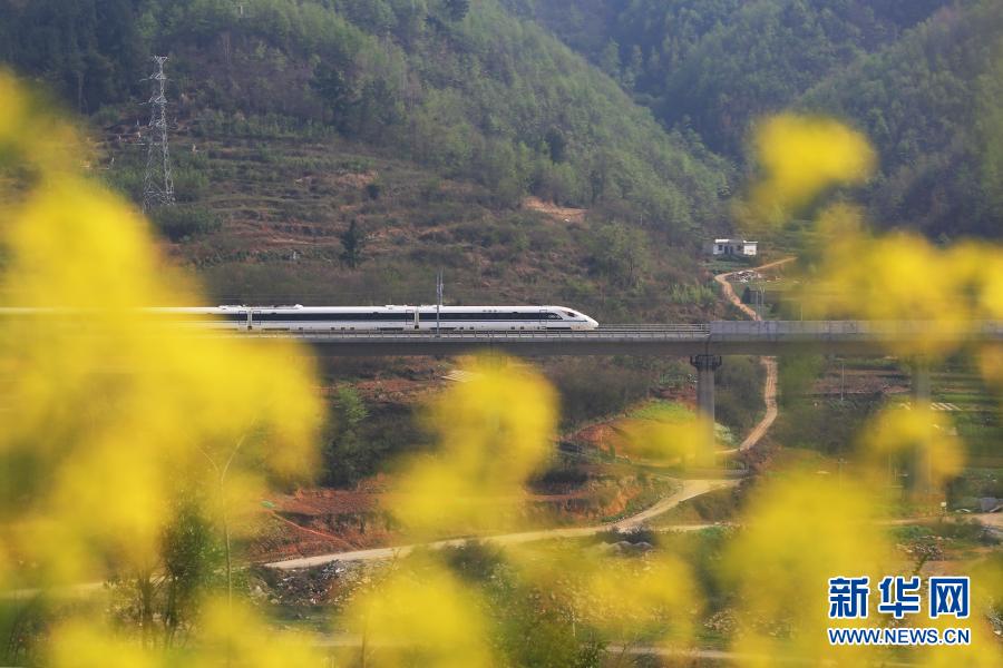 成贵高铁列车行驶在贵州省毕节市境内(3月25日摄)。