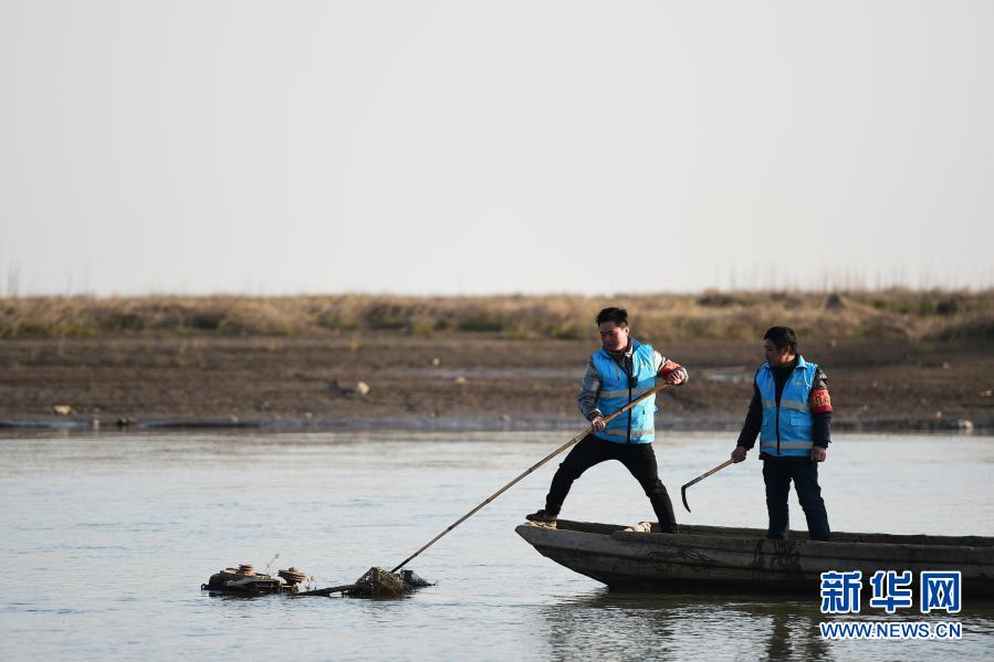 12月16日,蔡小华(左)在石臼湖上清理废弃的渔网。
