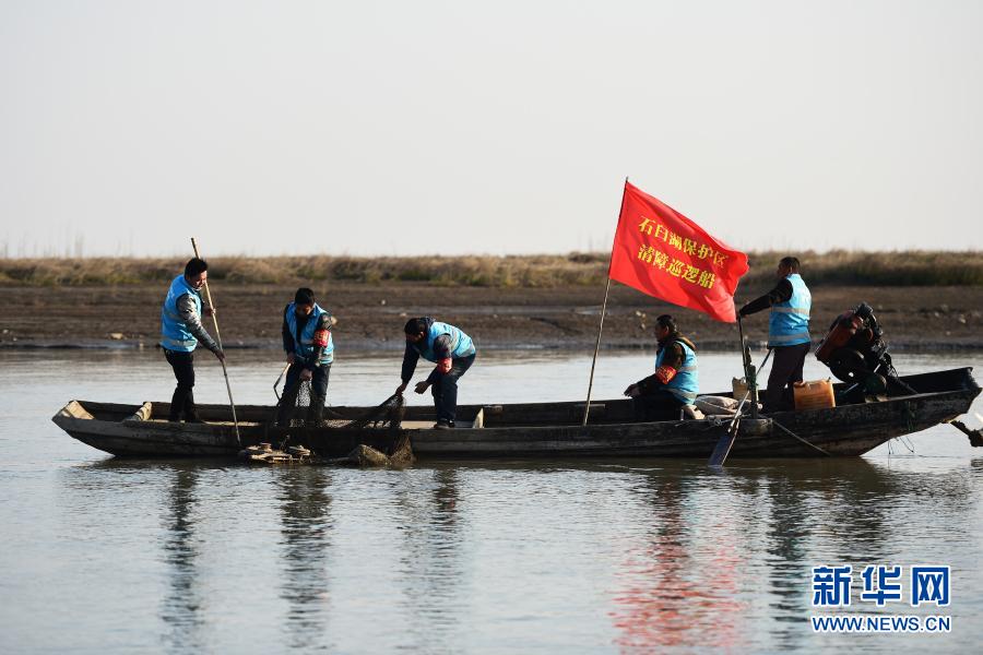 12月16日,蔡小华(左一)和队员们在石臼湖上清理废弃的渔网。
