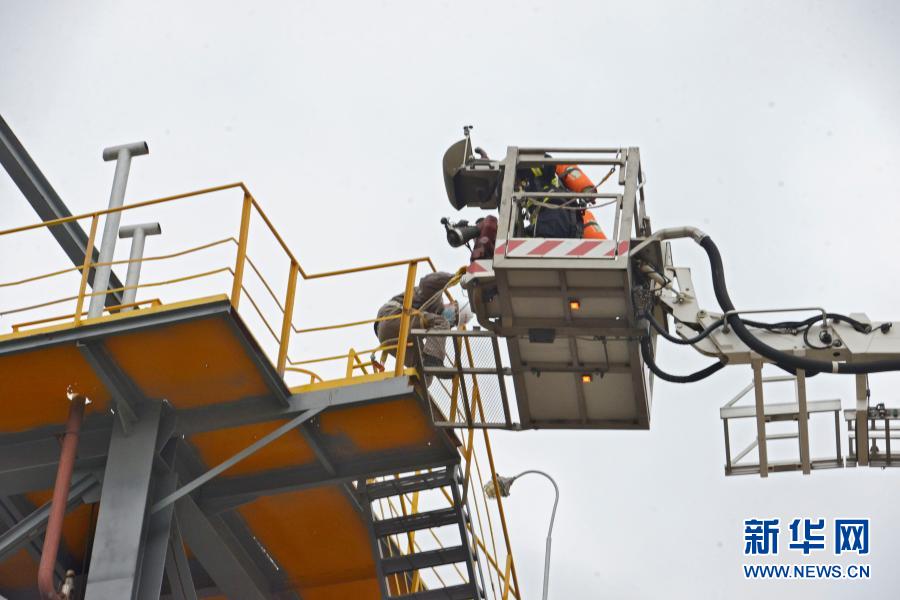 12月16日,救援人员在演练中运用云梯救助受困人员。