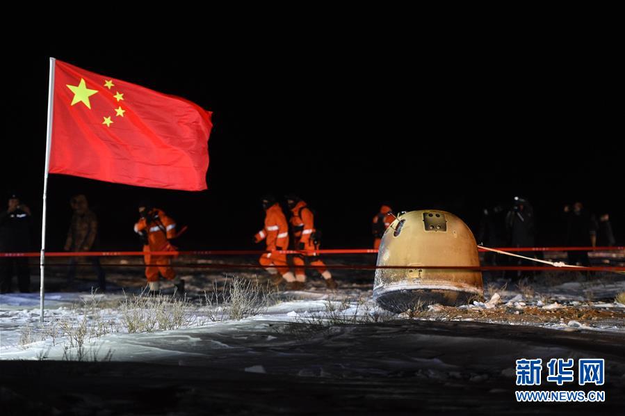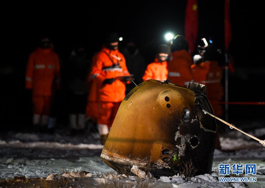 这是12月17日拍摄的嫦娥五号返回器。 12月17日凌晨,嫦娥五号返回器携带月球样品,采用半弹道跳跃方式再入返回,在内蒙古四子王旗预定区域安全着陆。 新华社记者 彭源 摄