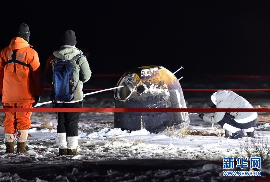 12月17日,工作人员在嫦娥五号返回器着陆现场作业。 12月17日凌晨,嫦娥五号返回器携带月球样品,采用半弹道跳跃方式再入返回,在内蒙古四子王旗预定区域安全着陆。 新华社记者 任军川 摄