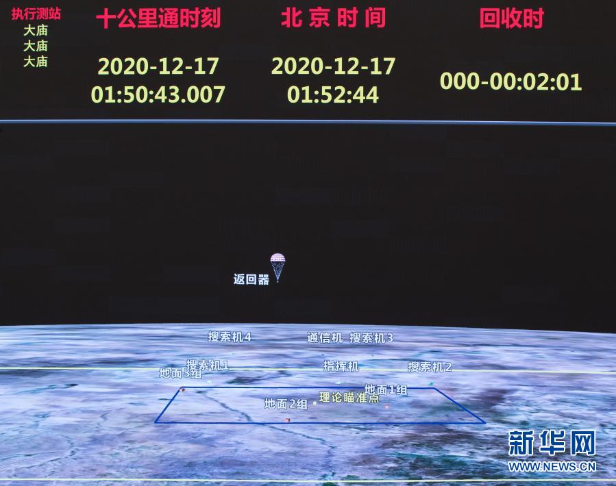 在北京航天飞行控制中心指挥大厅拍摄的嫦娥五号返回器在内蒙古四子王旗预定区域着陆示意图(12月17日摄)。新华社记者 金立旺 摄
