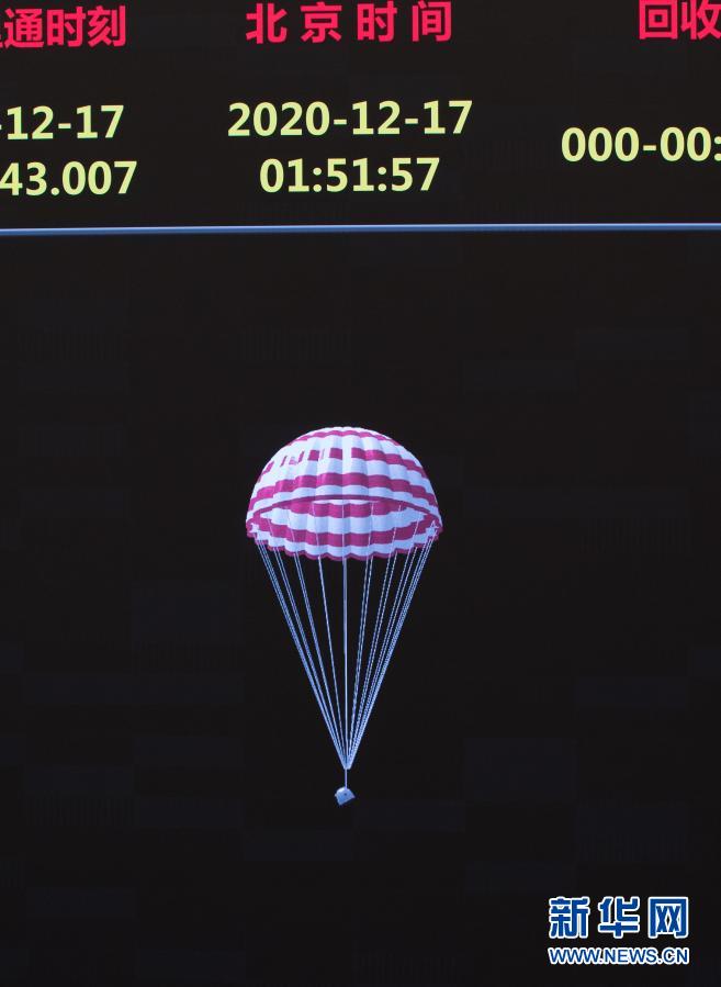 12月17日在北京航天飞行控制中心嫦娥五号任务飞控现场拍摄的嫦娥五号返回器着陆示意图。新华社记者 金立旺 摄