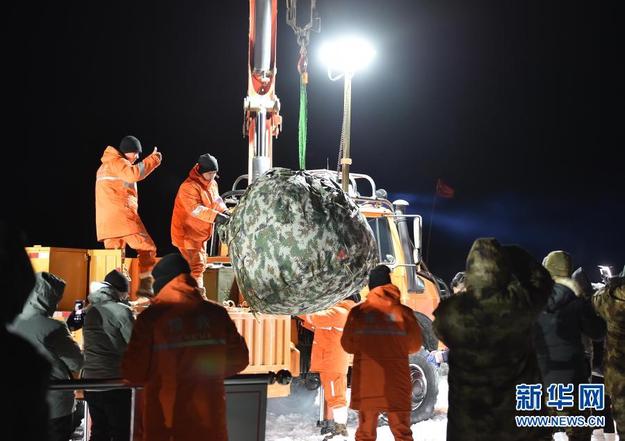 12月17日,工作人员将嫦娥五号返回器吊运至装载车辆。