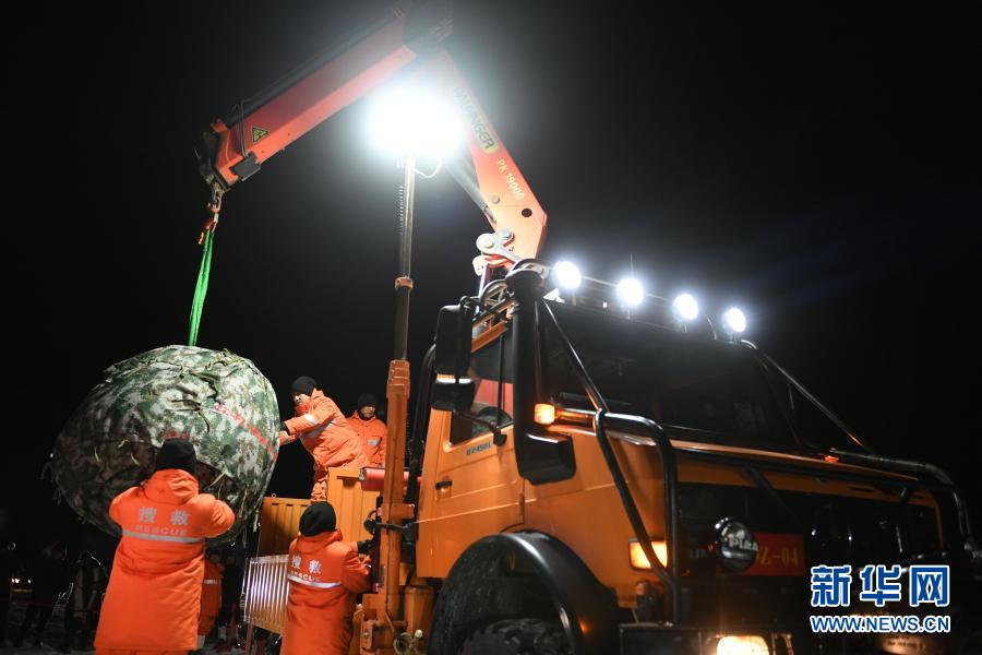 12月17日,工作人员将嫦娥五号返回器吊运至装载车辆。