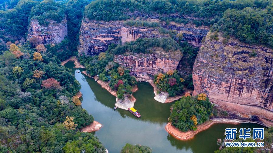 这是12月9日拍摄的福建省三明市泰宁县大金湖景区的水上丹霞景观(无人机照片)。新华社记者 姜克红 摄