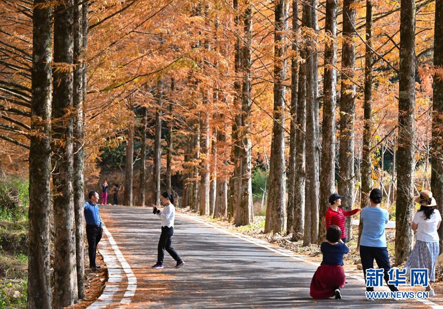 游客在福建省三明市将乐县国家级自然保护区水杉大道游览(11月20日摄)。新华社记者 宋为伟 摄