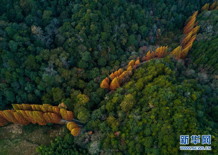 这是11月19日拍摄的福建省三明市将乐县国家级自然保护区水杉大道(无人机照片)。