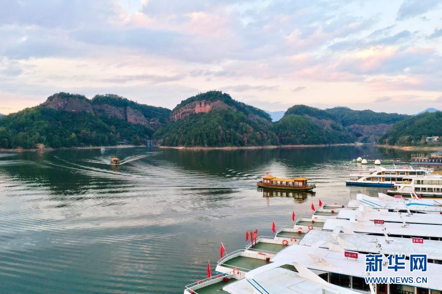 游船驶向福建省三明市泰宁县大金湖畔的梅口乡水际村游客码头(11月19日摄,无人机照片)。新华社记者 姜克红 摄