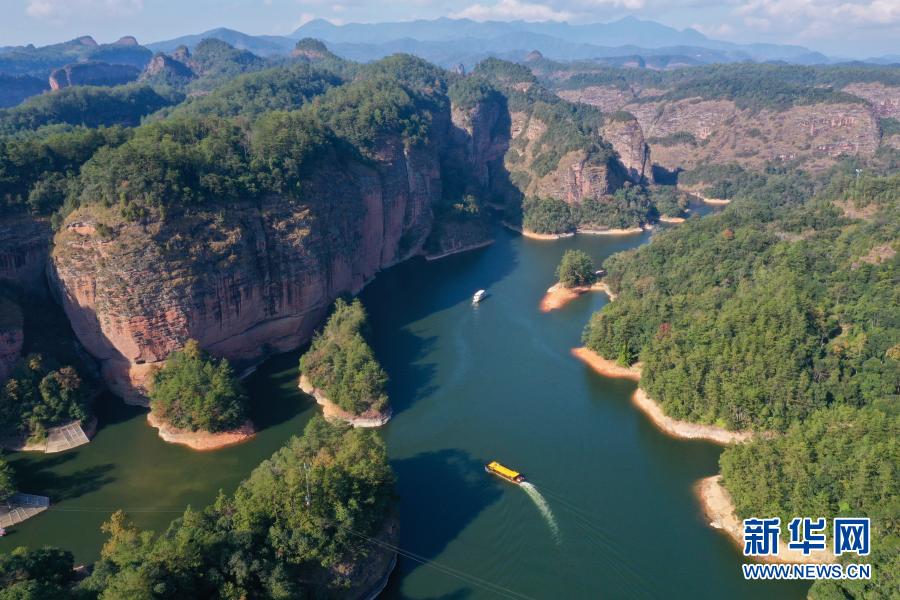 游船行驶在福建省三明市泰宁县大金湖湖面上,带领游客欣赏水上丹霞景观(11月20日摄,无人机照片)。新华社记者 姜克红 摄